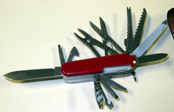 one of the largest Swiss Army knives I've seen; very nice; 1.25" thick and 3-5/8" long when folded