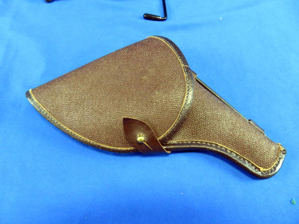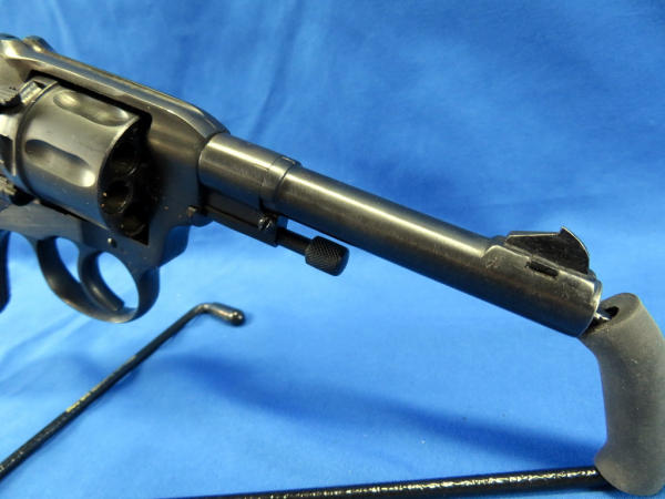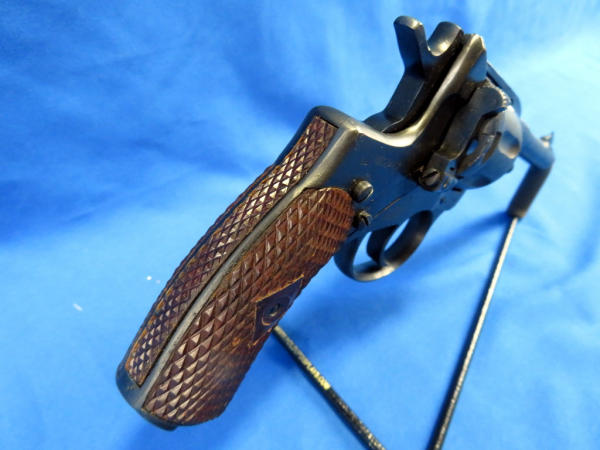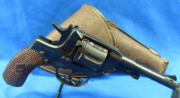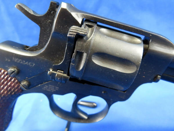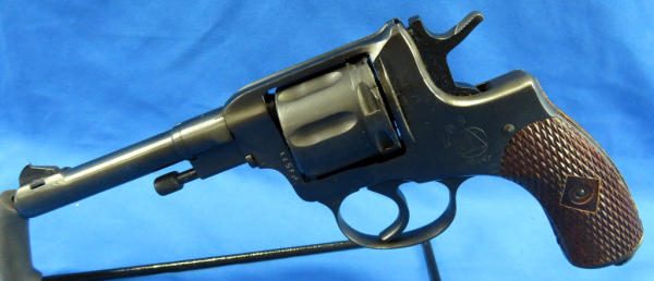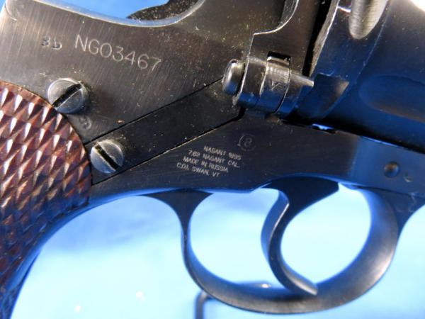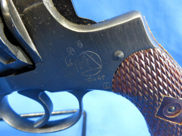 this is a Soviet Era Production model; dated 1944; Double action variation; 7-shot cylinder; called a "Gas Seal" b/c as the hammer is cocked, the cylinder is moved forward to engage the barrel breech forming a seal between the cylinder & the barrel; wood checkered grips; import marked; made in Russia; SN#NG03467; includes a period correct holster