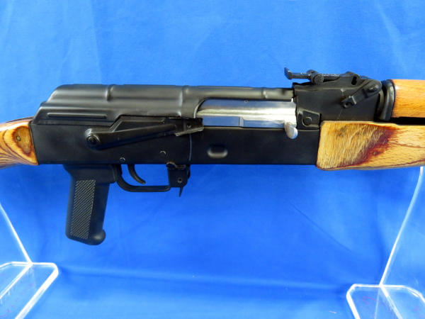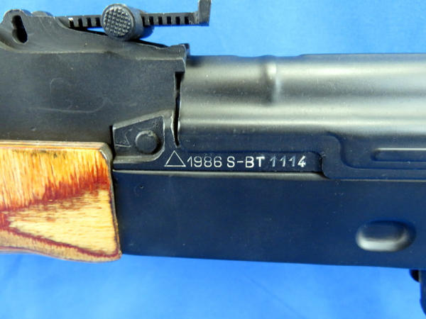 not sure on maker or origin; most likely 7.62x39mm; no magazine; wood is nice; steel is great shape; pistol grip; dated 1986; SN#BT1114