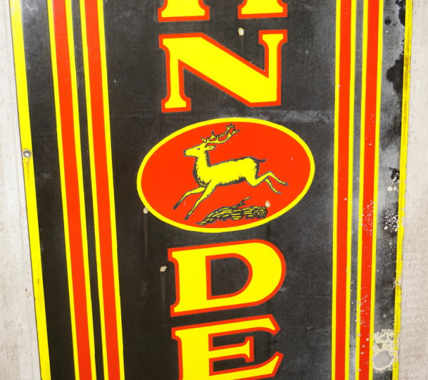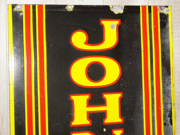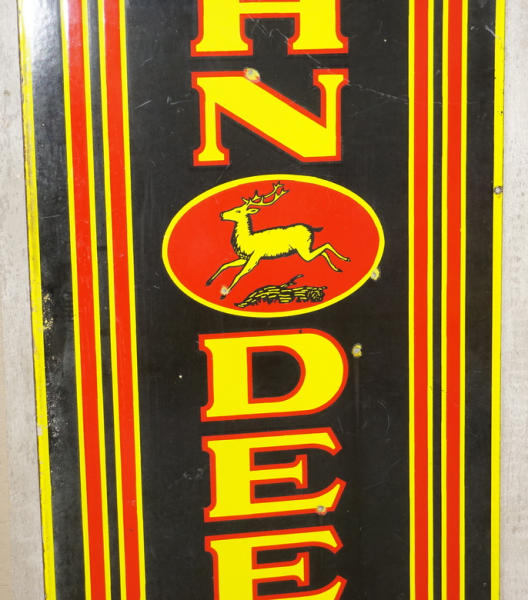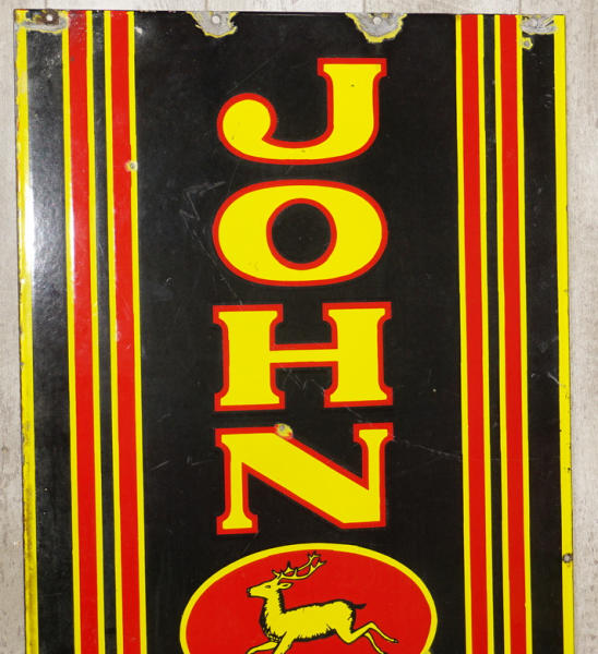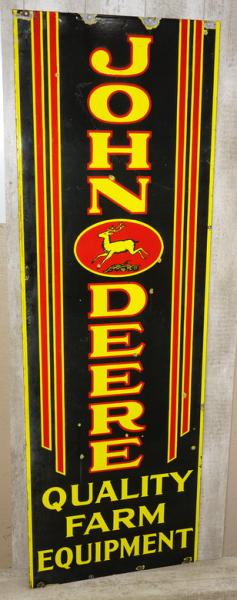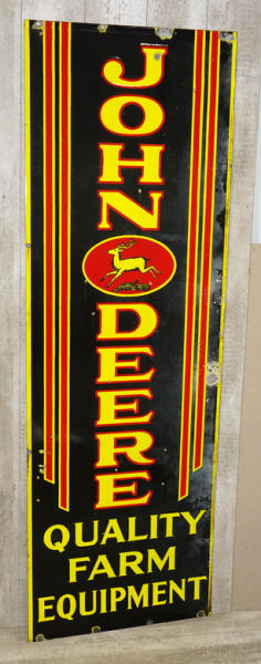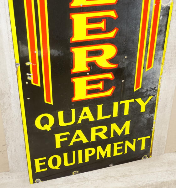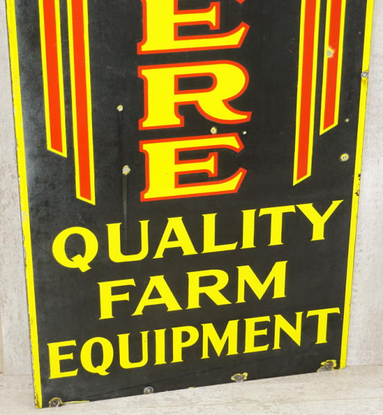other variation of this sign with the "Quality Farm Equipment" logo, 6'x2', has a few chips around the mounting holes and a few scattered small chips, some discoloration in the porcelain on one side, overall 8 & 7.5 condition sign, another nice and rare sign!