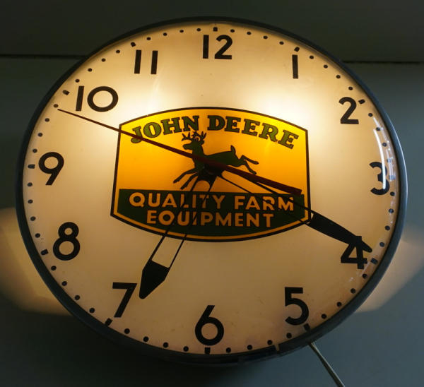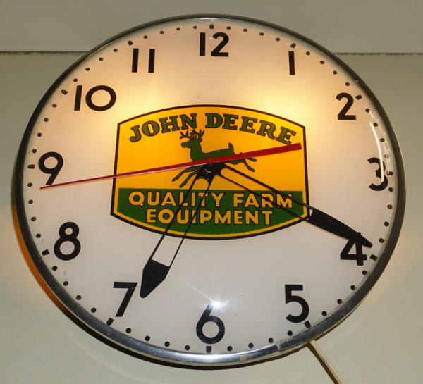 15" across, lights up & runs, trim ring is damaged and held together with tape, otherwise a really clean and nice original clock