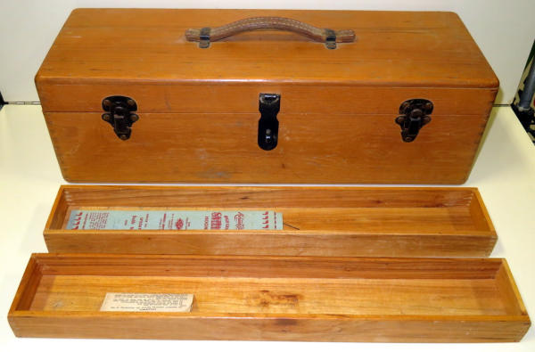has two removable trays; no makers mark, may be handmade; leather handle; 21" long