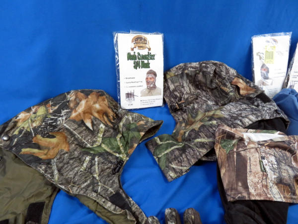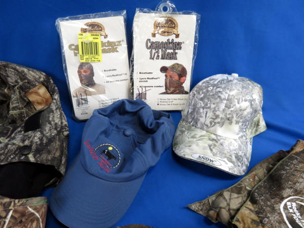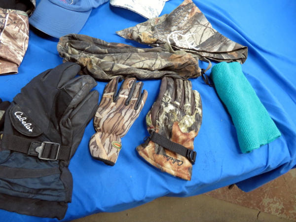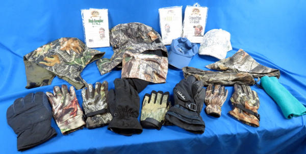 all gloves are singles, no matches; couple jacket hoods that didn't go with any previous coats; hats, mask; w/RMEF duffle bag; all for one money
