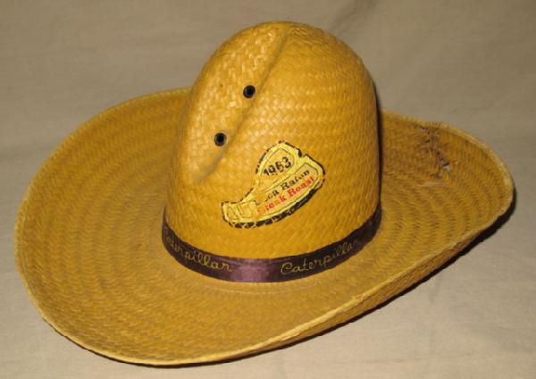 Unusual Large & shaped Straw Hat with CATERPILLAR Band and a screen printing on the side of a T-Bone steak that reads "1963 Boca Raton Steak Roast", has some damage to the back side of the brim, but displays well, never seen another one