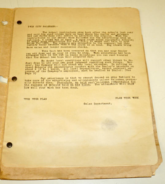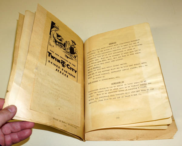sent to dealers to promote Power Farming School; basically to teach farmers how to use tractors & power equipment, has sample brochure inside plus some other ephemera, some water damage, about 12 pages, unique piece