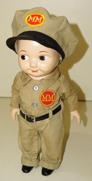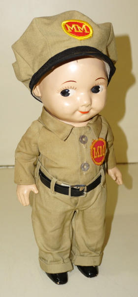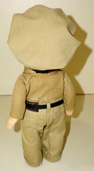 about 12" tall, original uniform, but the hat is a nice replacement, doll is clean and nice