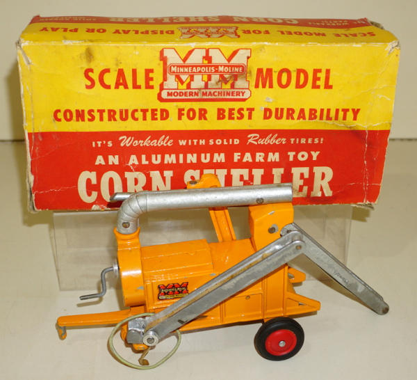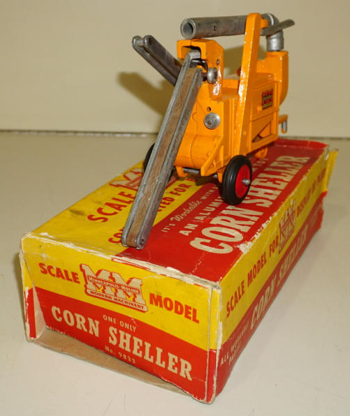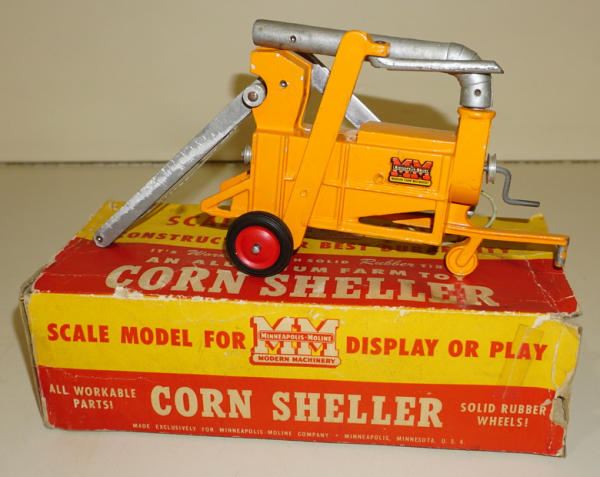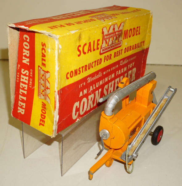 Clean and nice original toy, near mint original, just a few light chips on the hitch and were the spouts rub on the top; box is missing 2 inside flaps and has pretty heavy wear; box overall rates 6.5-7 condition; not the best but the only Corn Sheller box we have ever offered that I can remember