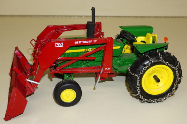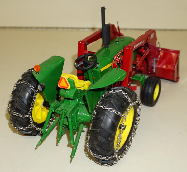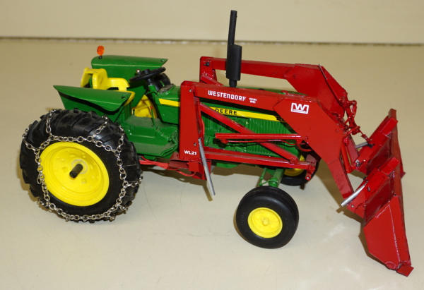 Ertl tractor heavily customized with 3pt, lights, levers & more; loader is all scratch built with lots of detail, but very light and very fragile; no shipping