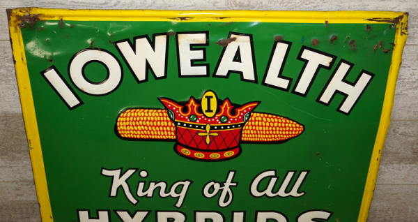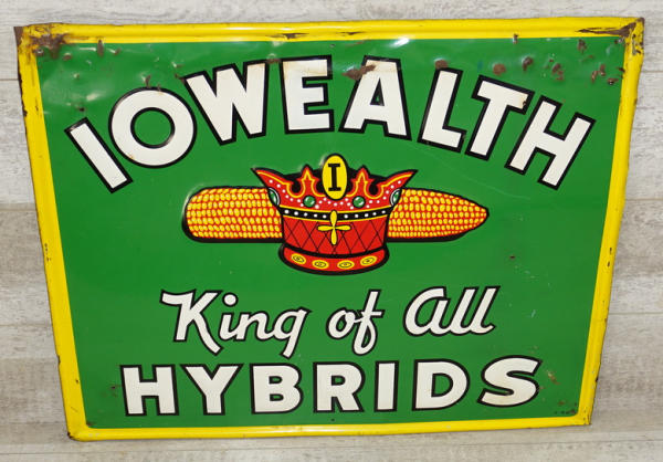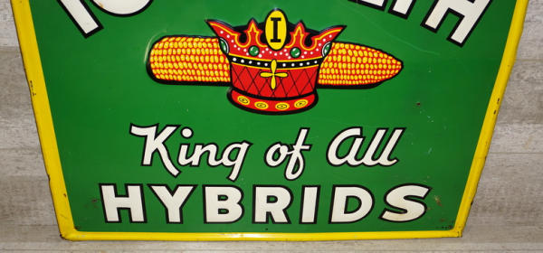29"x23.5", super color and graphics, was found nailed up backwards in a barn, so there is some damage to the top 4" or so of the sign and a few extra nail holes, not perfect, but one of the most colorful old seed corn signs we have handled, great piece!