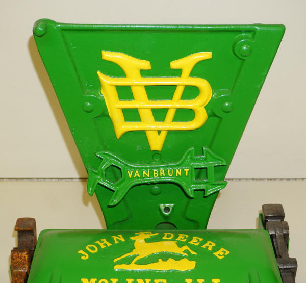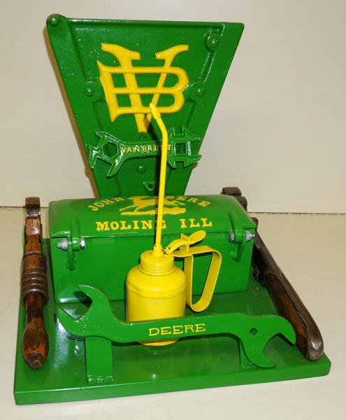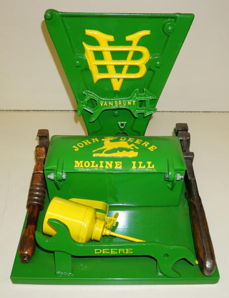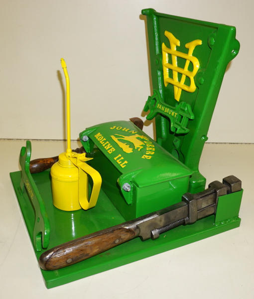 Original VB Grain drill end, tool box, & 2 wrenches plus 2 generic monkey wrenches & oil can, all restored & repainted mounted to a steel base, neat display; this was built by Luke Clement out of Canada, we sold several different ones years ago when we did his collection and this one is coming back through from one of the original buyers, neat & very heavy!
