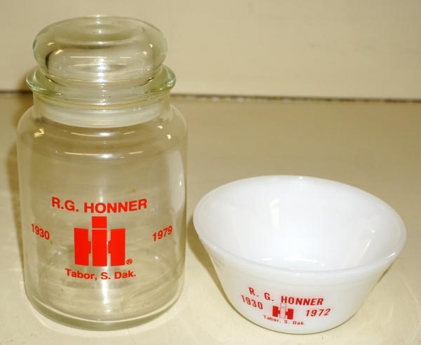 bowl is 5" across, Candy jar is 7" tall, both nice, 2x the money