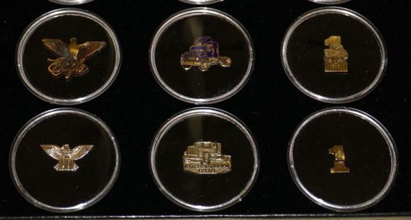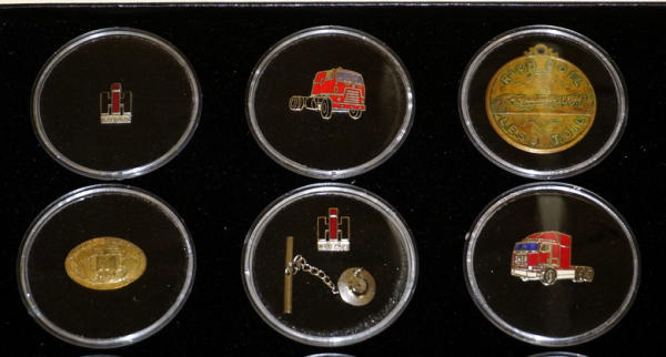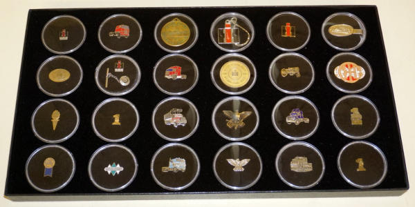 24 different pieces, mostly hat pins, but includes a tie bar, keychain & more, includes a 1957 Truck piece, 1940 Blue Ribbon pinback & more, all to go for one bid