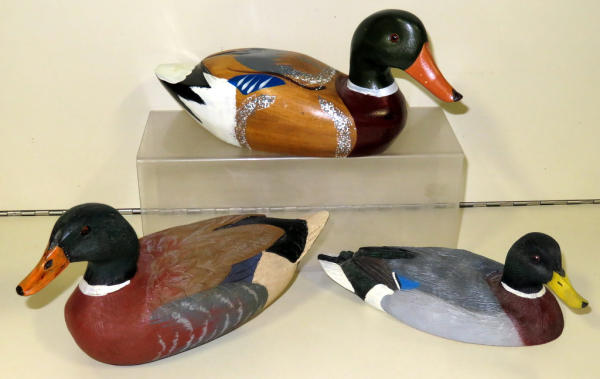a little small than a regular decoy; one is signed S Santi? 82; One is Franklin Gallery and made of a resin; bigger ones are wood; 10" long is biggest one; sell for one money