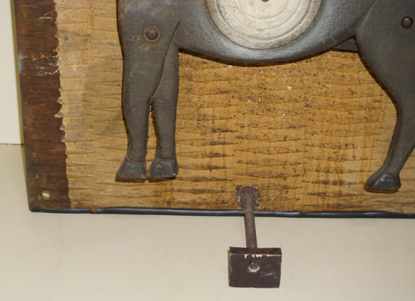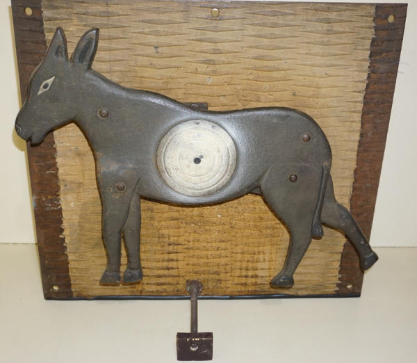 back plate is 27"x24" overall, donkey is 22" long and 18" tall, all working condition, hit the center and the leg kicks out; super heavy, probably close to 75-pounds overall; local pickup would be preferred or could be crated at the buyer's expense; fantastic piece for the collector that likes unique pieces!