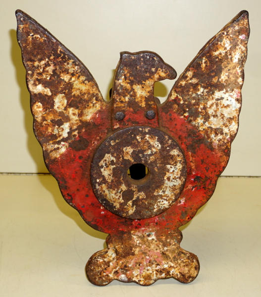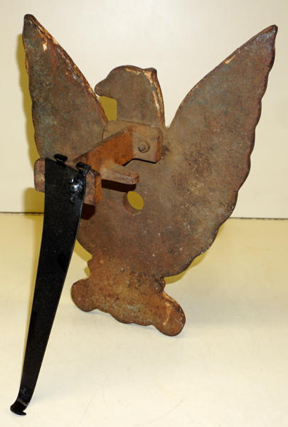 11" wide, 14" tall, great original patina, about 1/2" thick cast iron, has homemade stand on the back so you can stand to display, neat piece of iron