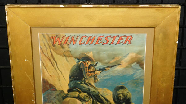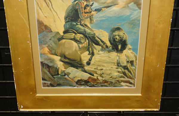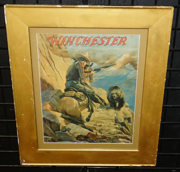 original calendar top that has been framed, no metal bands, overall is 26"x21", image is 17.5"x13.5"; just a plain frame, great image