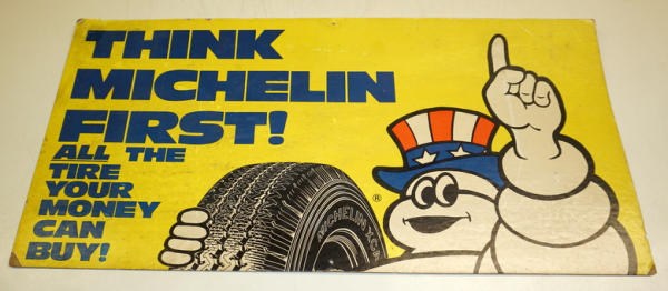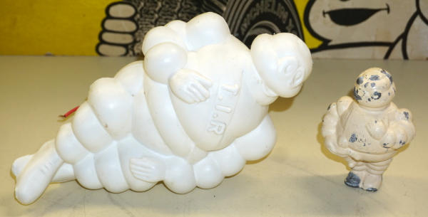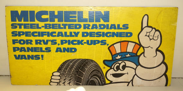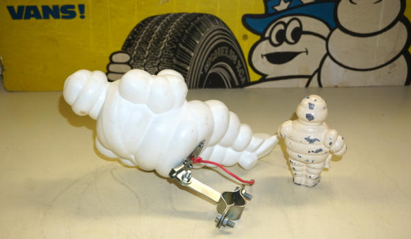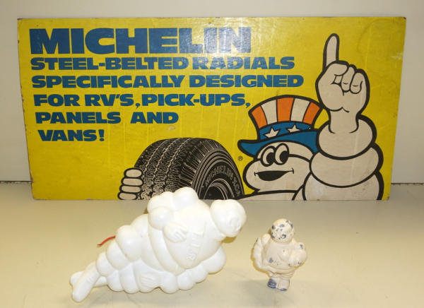 sign is 24"x12", has some wear, plastic Michelin Man was designed to clamp onto your bicycle handle bars, all to go