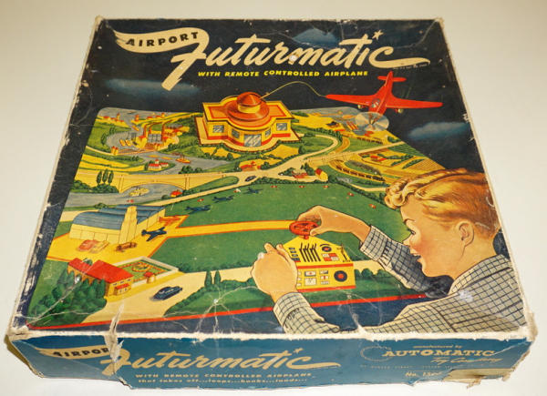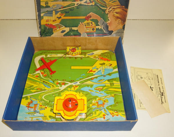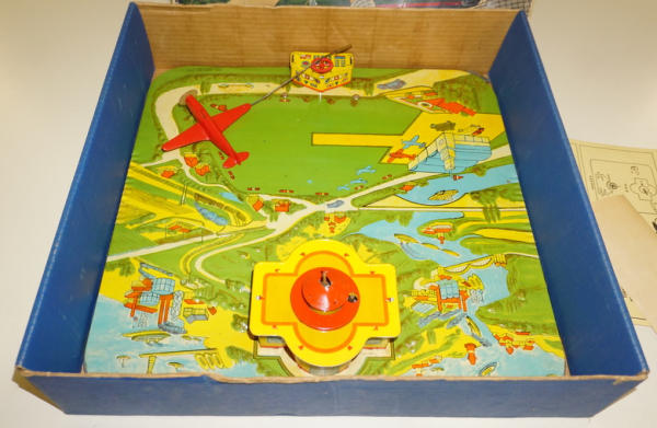 toy is about 15"x15", tin with beautiful litho & colors, looks complete, box is tattered and has heavy wear, neat toy