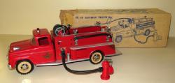 Near mint toy, includes the hydrant, one of the hoses is still attached and the other hose has an end broken off, box is complete with some light wear and water stains, overall a very nice example