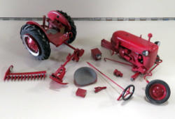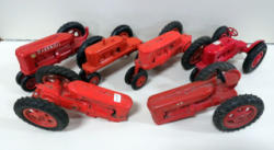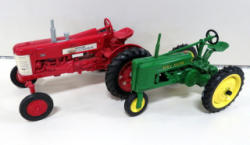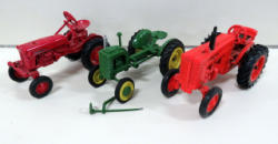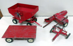 NI picker by topping; Farmall wagon by PM; Tru-Scale pickup bed trailer & JD wagon; all have wear; all for one money