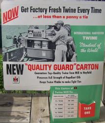 32"x25", NOS and never used, great graphics of the twin getting loaded into a #45 Baler, designed to display a single roll of twine, even includes a few original brochures, neat piece