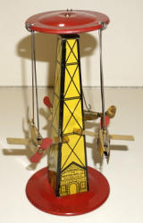 14" tall, super graphics, not sure who or where it was made, but looks to be German; Zeppelin is 10" long and nice, airplane is 7.5" long and has some light play wear, not sure if 100% complete on the mounting bracket; includes a new replacement key, Battery OP. Light in the tower