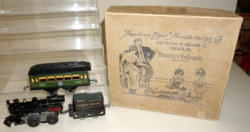 O-gauge, diecast engine, car & caboose, all pretty clean and nice, all to go for one bid; original 2pc box has some pretty heavy wear, but included
