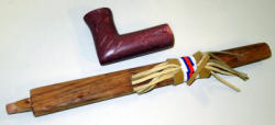 believe the stone is a portion of a larger pipe, has part of the stem broke off inside; stone is 6-1/8" long and no signature; stems are 16" & 9-1/4" long; big one has some slight damage on one end; sell al for one money