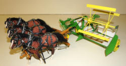 all metal grain binder, custom flocked team, 1/16th scale so about 1/2 the size of a Breyer team, full leather harness, nice looking set