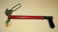 early toy, 14" long, unique mechanism that uses a paper over the end of the barrel to pop with air, no caps, paint has general wear, but overall does work, neat piece