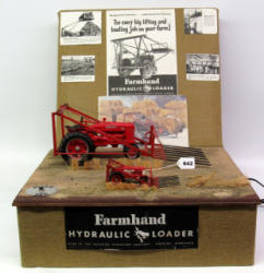 Electric Operated Farmhand; Farmall M w/Farmhand Loader Custom Made; also a 1/43 scale Version 350 Farmall w/Farmhand Loader; Custom Made; Made by Paul Radabaugh. 110v, push the button and it raises and lowers the loaders on both tractors! No shipping, local pickup only
