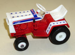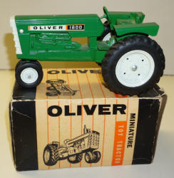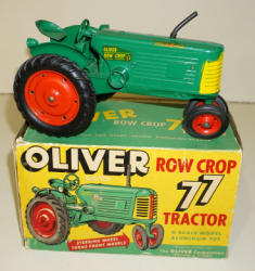 near mint original toy, all metal rims and wide drawbar; box is complete and square, one outside flap has been taped back one, has edge wear and discoloration, rates 7 condition