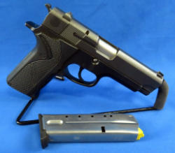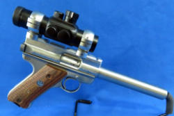 5" Stainless Barrel; rubber sleeve grip added; has BSA laser sight, batteries are down so couldn't test; red ramp sight w/rear white outline; original box; 2-magazines; SN#G00574