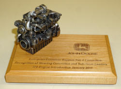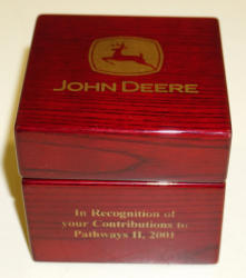 1/16th scale toy skid loader on plague, this is an ACTUAL Tee marker from the JD Classic tournament, not the commemorative that we sell from time to time, came from a retired JD executive that worked in the skid loader division, light scuff on the wood and a little dusty, comes with a plain brown box that was shipped to the Avalon Golf Club in Lenoir City, TN; box has some water damage