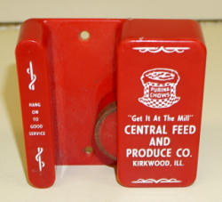 18"x18", has large spot of paint loss on the bottom edge, otherwise good color, rates 7.5 ; this was Pioneers "Red Comb" Chicken Feed logo