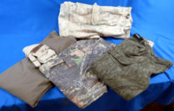 all gloves are singles, no matches; couple jacket hoods that didn't go with any previous coats; hats, mask; w/RMEF duffle bag; all for one money