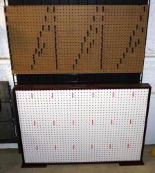 largest piece is about 36"x48"x3" thick, double sided, comes with an extra piece with a bunch of extra hooks, Dickie used these to display tools; no shipping, local pickup only