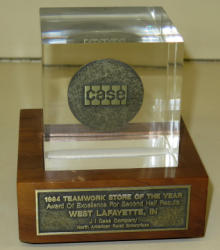 Heavy lucite Award on wood base w/ metal plaque, about 6"x6"x6" overall; has some scuffs