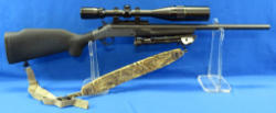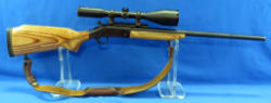 24" BBL; easy break action; hammer extension; wood grain laminate stock; great condition; Leapers 8x56 scope; leather sling; nice gun; SN#HT221957