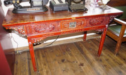66" wide, 25" deep, 35" tall, has a drawer, some damage to the end legs and general wear