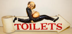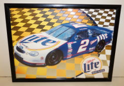 28"x23", 2.5" thick, plastic sign, farmer has a chip on the hat, otherwise nice, wood frame