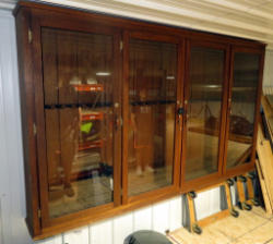 has glass door w/lock & key; guns double up inside; picture is of cabinet upside down, due to the brace on the bottom, won't stand up right side up; very nice; measures 29"x11"x55"; NO SHIPPING, local pickup only