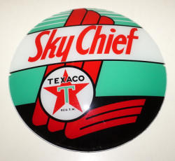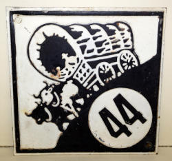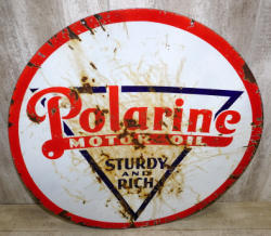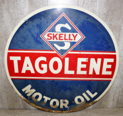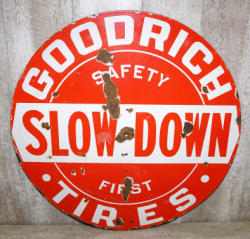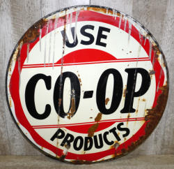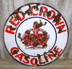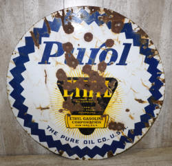 42" diam, both sides have heavy chips, scratches and sign is bent up, barn hanger condition