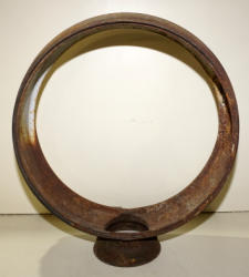 25.5" Diam, one side has large spots of paint loss and paint drips; other side is completely rusty, barn hanger