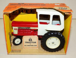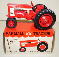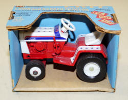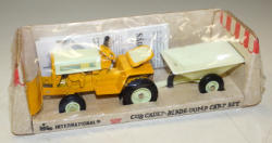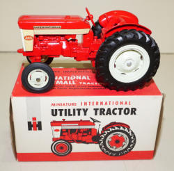 near mint toy, metal rears, plastic fronts, factor "International" decals that would have been used on the utility tractor; box is square, clean and nice, box rates 8.5 condition; nice piece