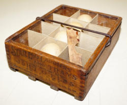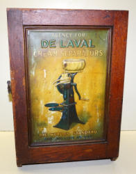 10"x18"x26", original tin sign is discolored from age, might clean up with some work, original finish on the wood, inside is very full of NOS DeLaval parts, nice piece
