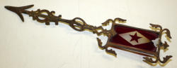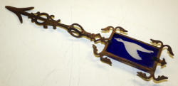 9" long, wood base with metal scale, has original brass tag, made in Gardena, Cali, nice original