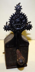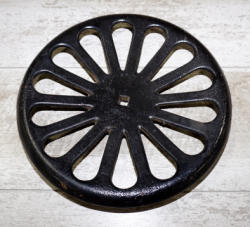 18" across, works, made by Lakeside Manf. Of Chicago; comes the original old wrought-iron twisted steel stand, looks great, clock has some old overpaint and general wear