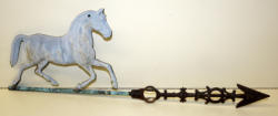 32" long, 11" tall, cast iron arrow has pitting; horse has some damage where it mounts to the bracket and a hole going through the head