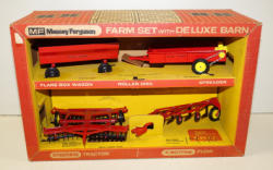 has the 4 yellow wheel implements, but no tractor, box has some discoloration and wear, has the divider, overall box rates 7.5 condition
